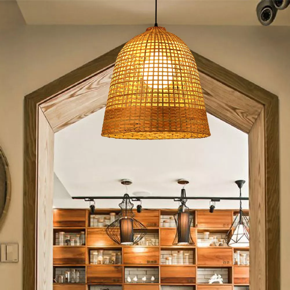 La lampara colgante está hecho de bambú ecológico, con tejido hecho a mano y detalles finos, proporcionando una sensación de ligereza y calidez al ambiente.