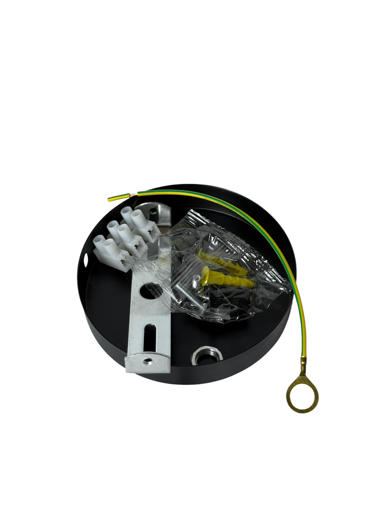 INCLUYE: Pantalla, porta lámpara, y platina en chapa terminación para techo con respectivos tornillos para su fijación.